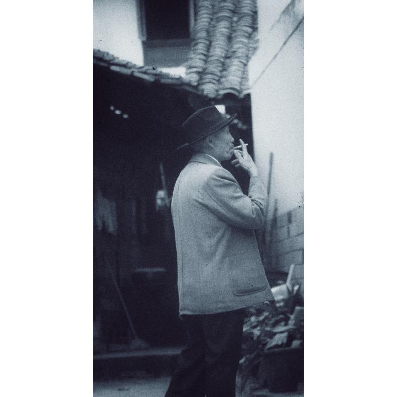 该作品拍摄于眉山市刘江镇,作品中老者饭后在路边与朋友一边抽烟一边闲聊,身着灰色外套,黑色长裤,头戴黑色帽子,加上抽烟姿势,生动的刻画了老一辈的形象。作品中背景是路边的瓦房,巷子里堆积着一些杂物,将画面带入了九零年代。