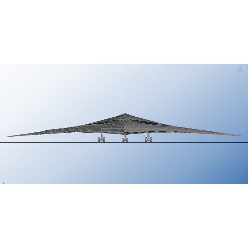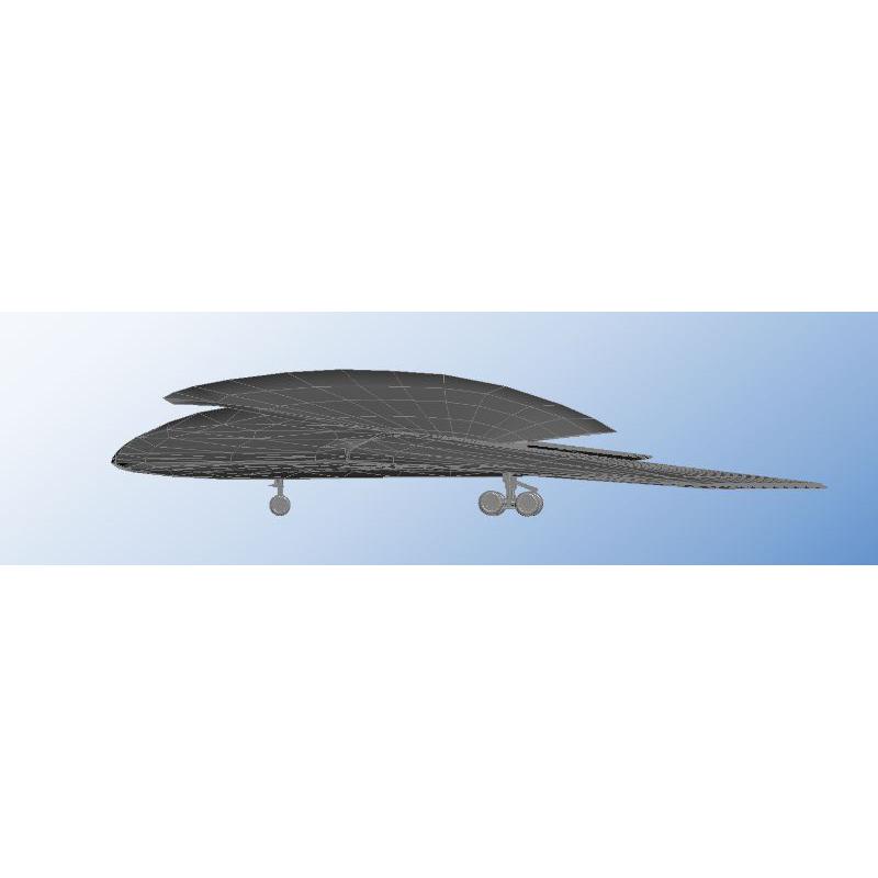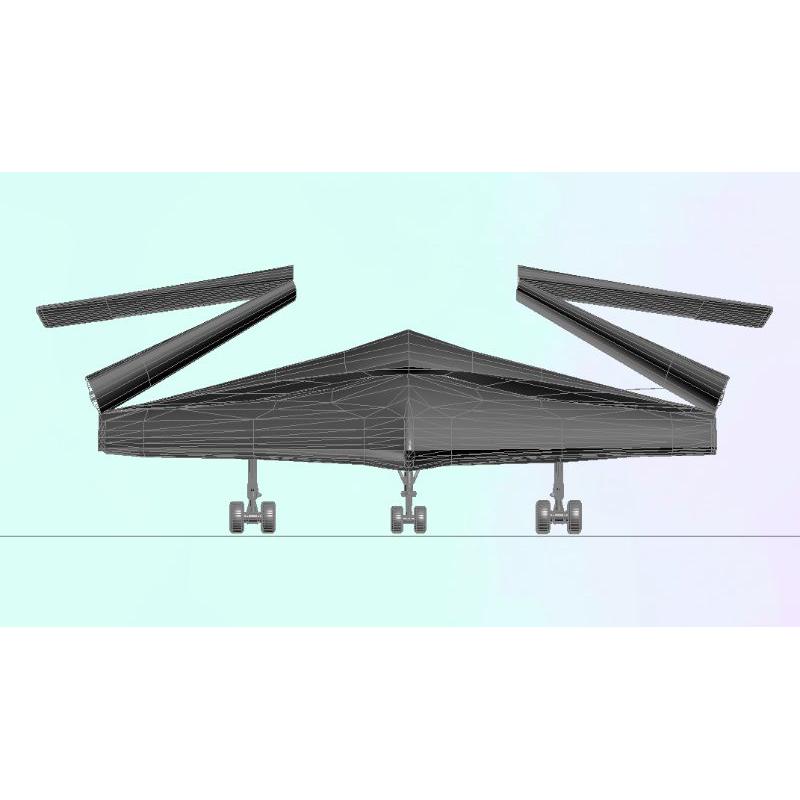 这是一架外形科幻且具有隐形功能的大型飞翼布局飞机。 它的最初设计理念是用于军事超远程物资投送。 因要求具有雷达隐形,所以外观都采用反射雷达波斜面设计。 其主要工作是用于超远程无人机对战斗机的远程投送。 其次也可用于救援物资的投送。