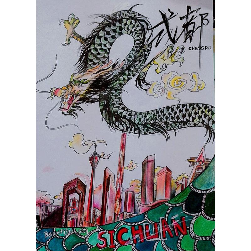 作品以成都元素,熊猫、脸谱、川剧、麻将、火锅等,表达出成都深厚的文化底蕴。