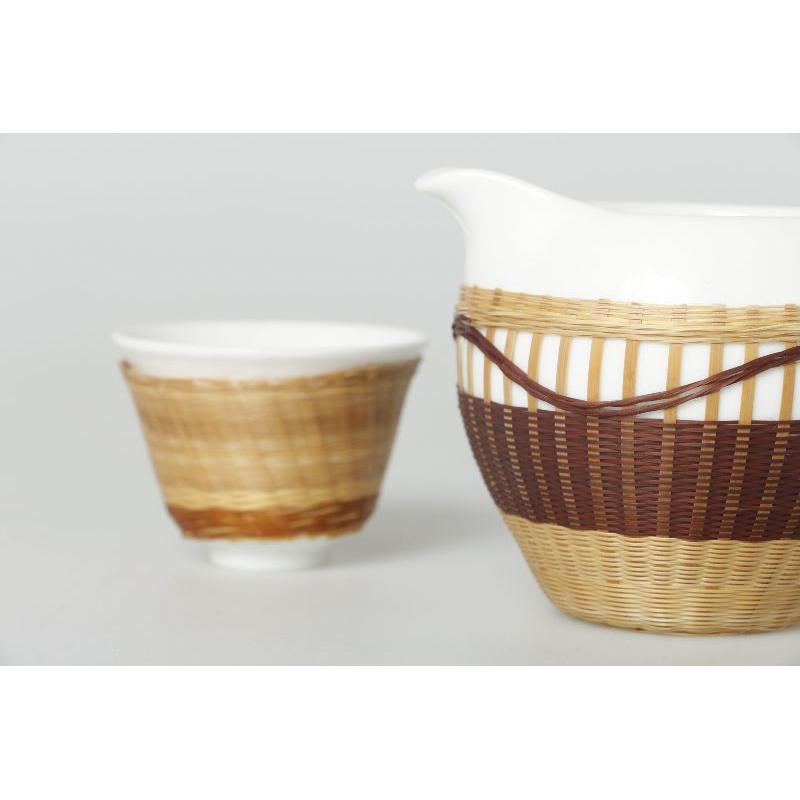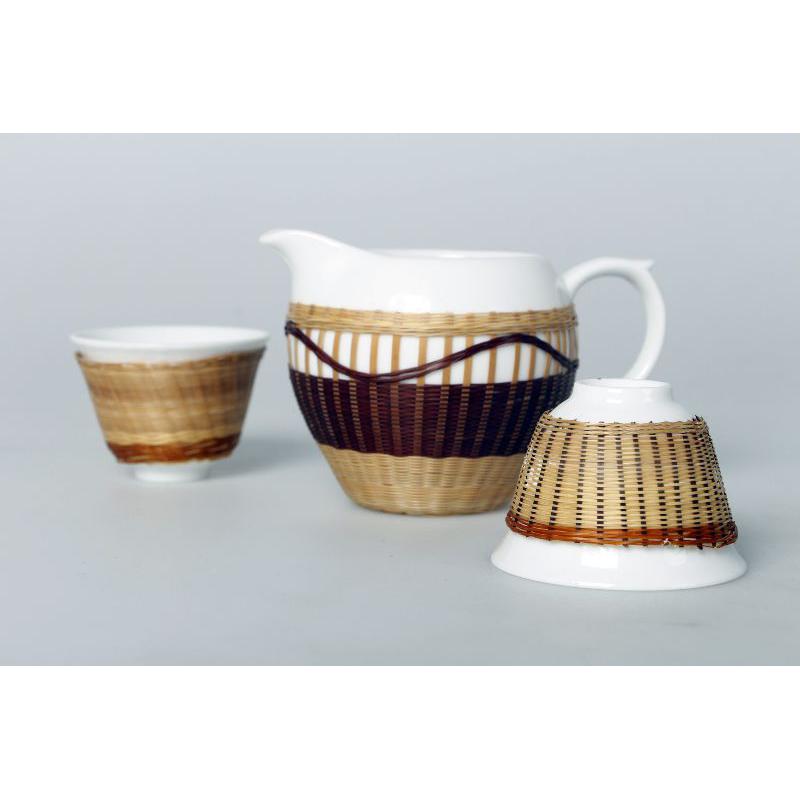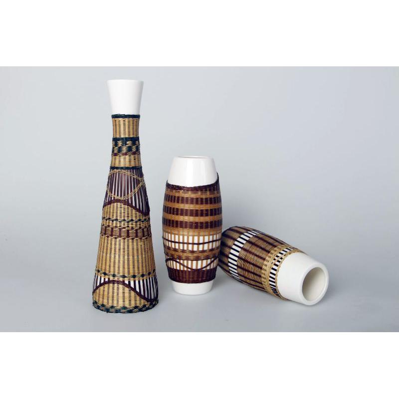 此作品以传统竹编工艺与现代艺术的相结合,运用少数民族的传统纹样为灵感,材质上运用竹丝与陶瓷的相融合,形式上延续传统竹编编法,在通透光亮的白瓷上进行颜色深浅的交错,进行纹样的波浪设计,如云似山峦。外框是流线型,简约大气,上下留白形式、现代化编法的融入更符合现代设计感。摆放在任何地方都给人一种复古又不失设计的感觉。