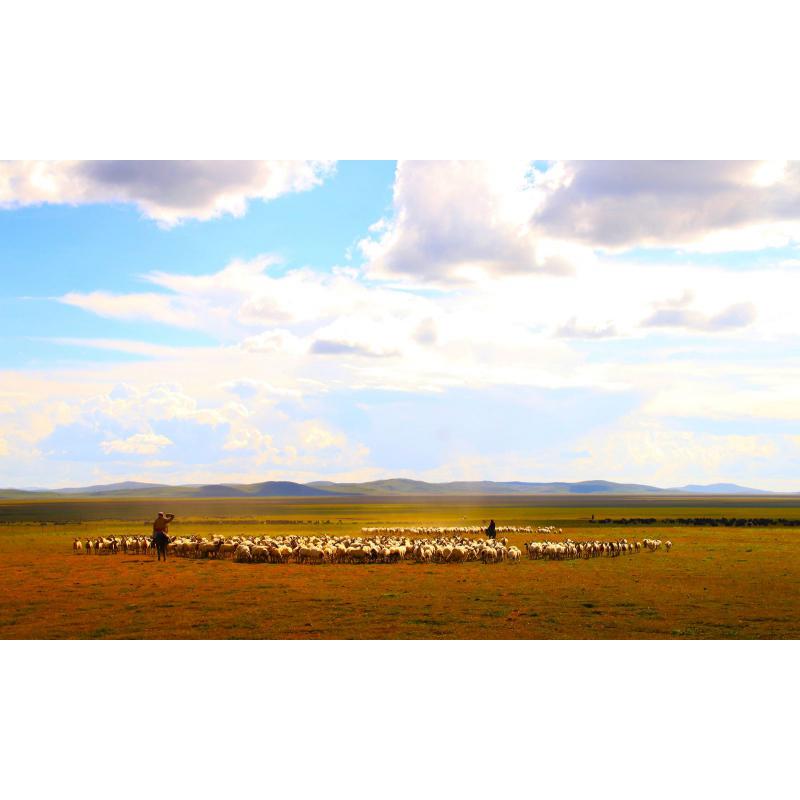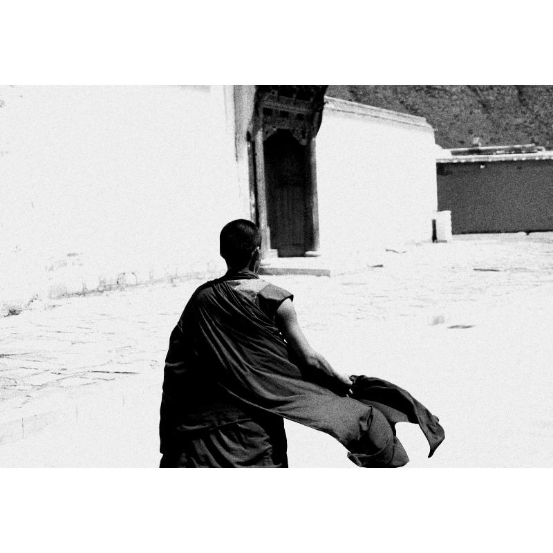 藏族寺庙外,一个年轻的喇嘛走在正午阳光下,走向注视着的很远很远的地方…