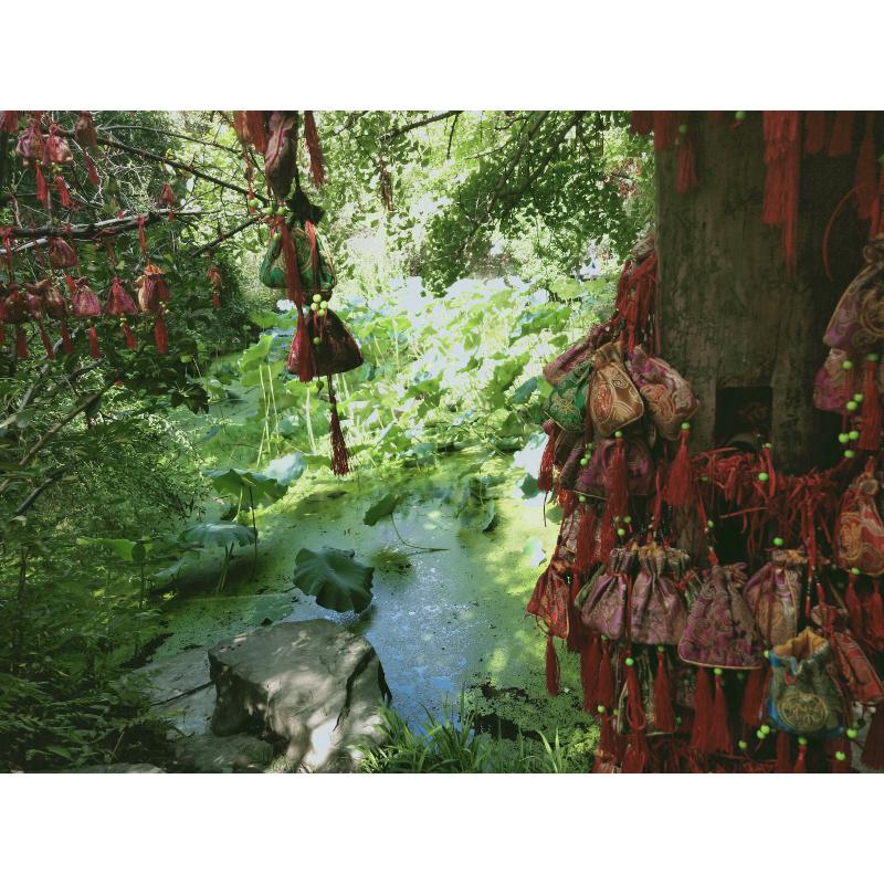 此照片于锦里拍摄,挂锦囊的树旁有一池与树相伴,映衬着锦囊中美好的愿望。