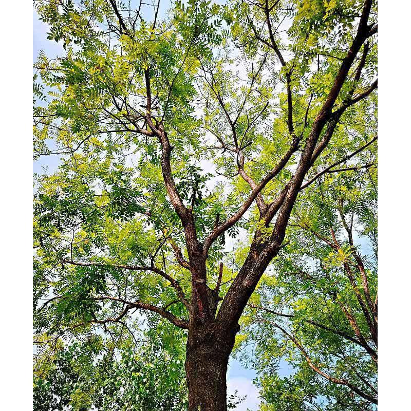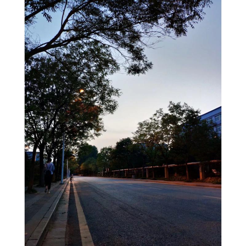 风儿轻抚着树叶哗哗作响,阳光四射在路边行人街道