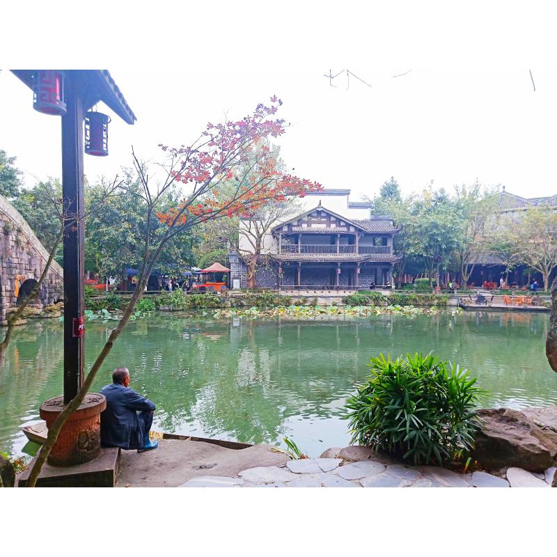 该摄影作品是在游玩成都市著名的黄龙溪景区时所拍摄的,老人的眼前是一汪青绿的湖水和一些古老的建筑,老人随性的坐在湖边与周围的景色相融合,形成一幅安逸静谧的画面,给人一种远离城市喧嚣的感觉。