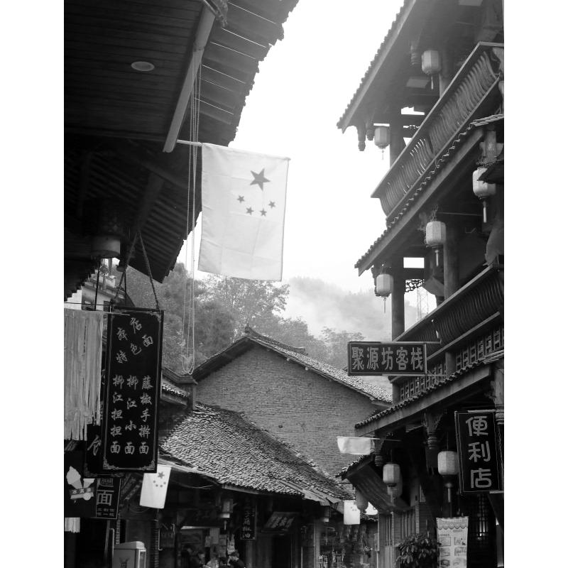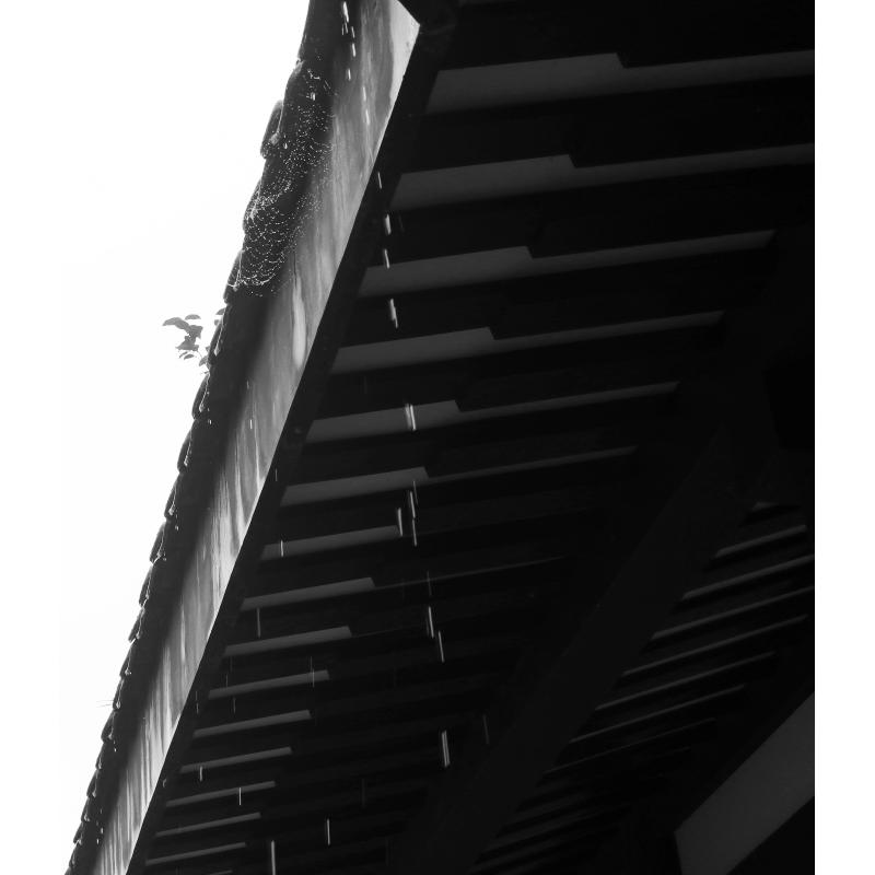 下雨天,抬头望天空,恰好看见雨水从房檐倾流而下,