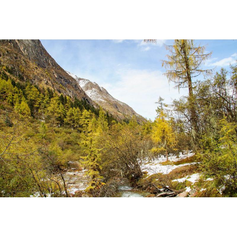 对潇潇暮雨洒江天,一番洗清秋。 秋天的颜色格外不同黄色的枫叶,蓝色的天空,白色的薄雪。天高云淡,水清而透彻。