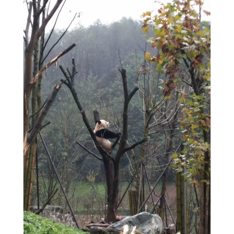 这只大熊猫一定在思考人生,坐在树杈上,一直望着前面思考。