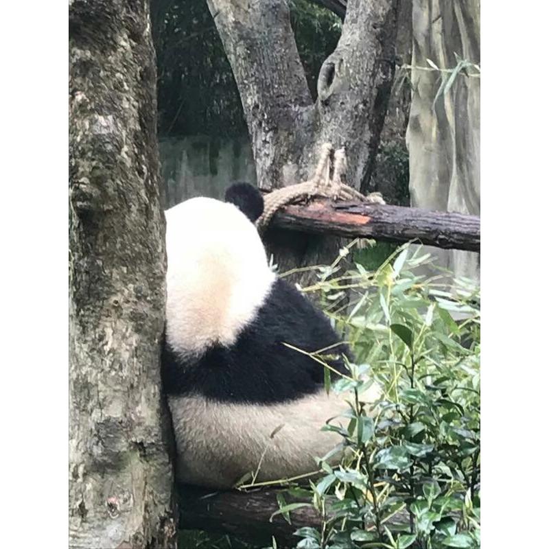 国宝大熊猫乃国家一级保护动物,大熊猫身体胖乎乎的,走起路来大摇大摆,一脸的悠闲自在样儿。吃竹子的时候更是心无旁骛,一度沉浸在自己的美食之中。黑而圆的双耳,黑黑的眼镜,围脖,手套和鞋袜,一度给人一种呆呆萌萌,憨态可掬的模样儿,随意的一举一动便萌化了万千少女心。此作品正是拍摄于大熊猫背靠着大树,悠闲的吃着吃着竹子瞬间呆住的时候。从这个角度看,大熊猫是不是正像吃着吃着瞬间想到了什么,即刻陷如熊思的模样。